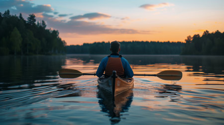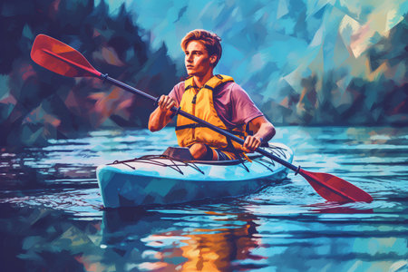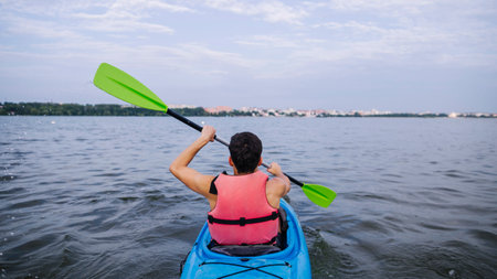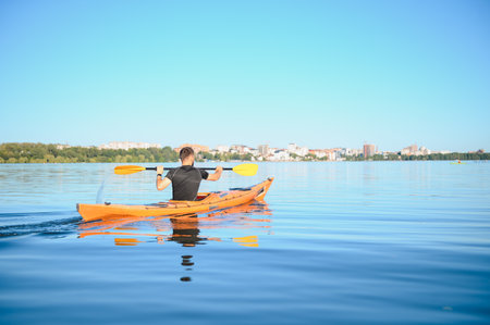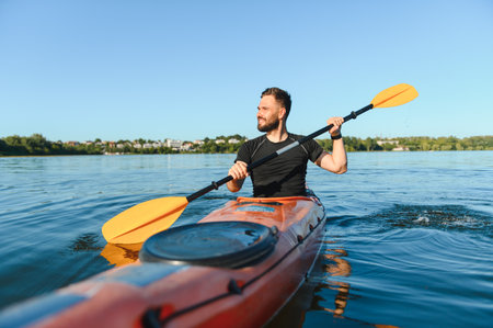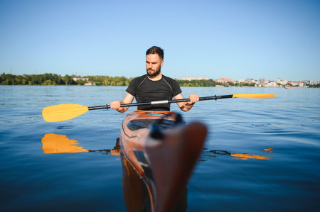 Young man kayaking on a serene lake, soaking up the sunny weather while enjoying an active day of water sports and outdoor adventure