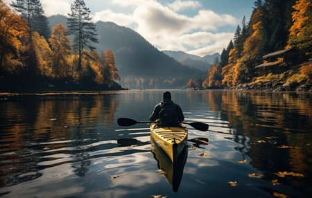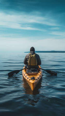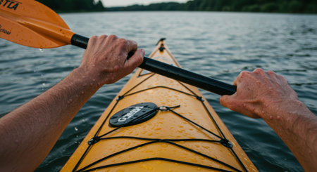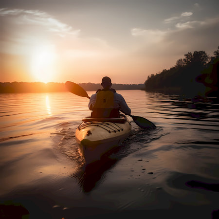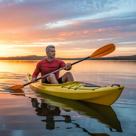 Man paddling a kayak across a serene lake, embracing the joy of active recreation and enjoying the thrill of water sports