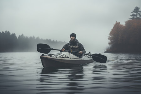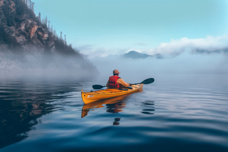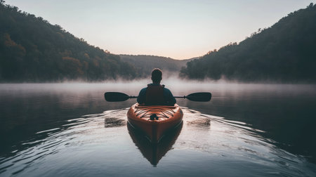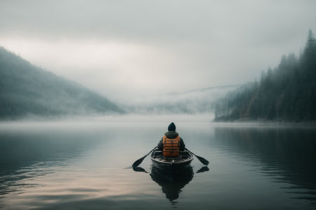 Kayaker paddling across a serene lake shrouded in mist, embracing the tranquility and breathtaking beauty of nature's landscape