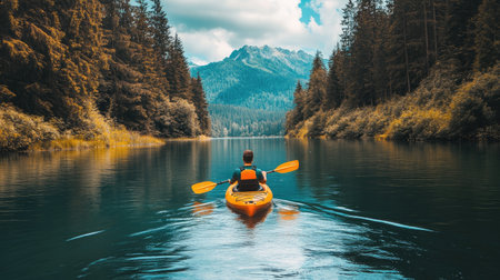 A person kayaking in a serene mountain lake surrounded by lush trees and vibrant landscapes. Ideal for adventure and nature themes.