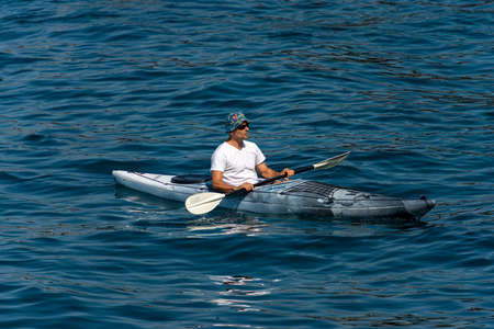 GULF OF LA SPEZIA, LIGURIA, ITALY - JULY 21, 2019: An adult man, 40-45 years, with a hat and sunglasses stops in the blue sea on a gray kayak after rowing, Gulf of La Spezia, Liguria, Italy, Europe