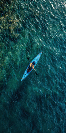Aerial view of a man in a kayak paddling in the sea, Person rowing on a calm lake in autumn, aerial view only small boat visible with serene water around, AI generated