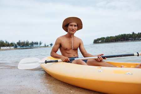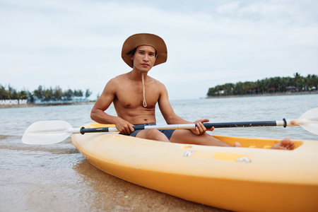 Happy Asian Man Enjoying Kayaking Adventure on Tropical Beach