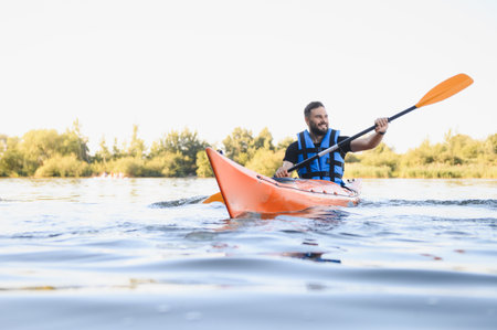 Man paddling orange kayak on river or lake wearing life vest, enjoying water sport activity on summer day