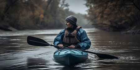Man paddling a kayak along a serene river, immersed in the beauty of nature while enjoying an active and adventurous outdoor lifestyle