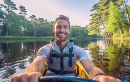 Man kayaking Handsome young man kayaking on lake and smiling : Generative AI