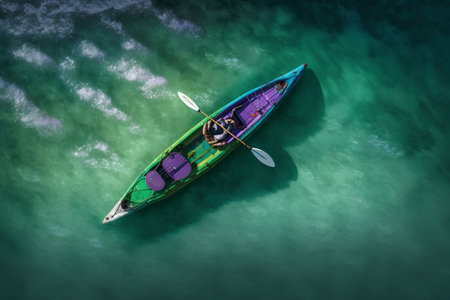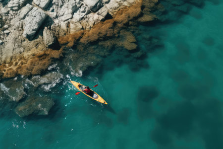Aerial view of a man in a kayak paddling in the sea, man paddling kayak on tropical island, AI generated
