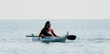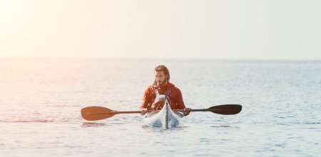 Man sea kayak. Happy free man in kayak on ocean, paddling with carbon paddle. Calm sea water and horizon in background. Active lifestyle at sea. Summer vacation.