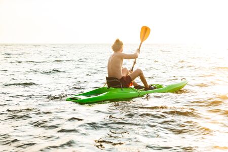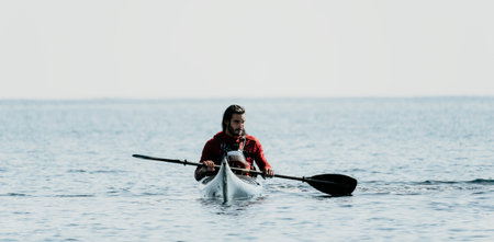 Man sea kayak. Happy free man in kayak on ocean, paddling with wooden oar. Calm sea water and horizon in background. Active lifestyle at sea. Summer vacation.