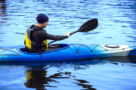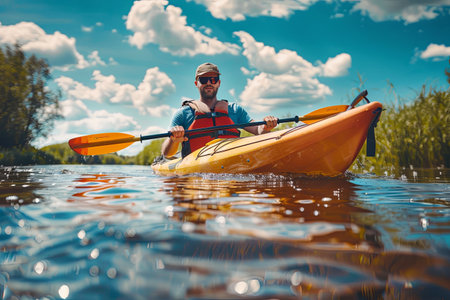 Man paddling kayak on a lake, enjoying water sports and the beautiful summer weather, during an active recreation day