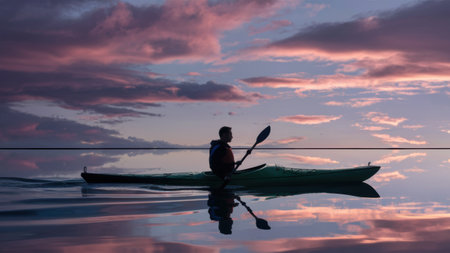A man gracefully kayaks on the calm surface of the water. Generative AI