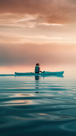 A peaceful scene of a person kayaking on a still lake at dawn, with mist rising from the water and soft light in the sky.