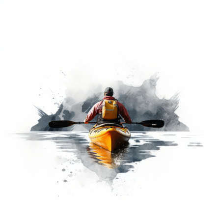 a kayaker gracefully floats in the water, captured in a unique inkblot style. the image showcases strong graphic elements and high resolution, resulting in a realistic landscape with soft, tonal colors. the composition features a blend of white and amber hues, creating an editorial illustration that is both captivating and visually striking. ai generated