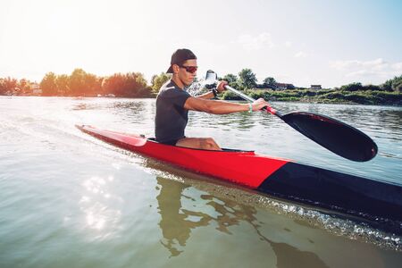 MOSCOW, RUSSIA - AUGUST 25, 2019: Kayaker man, kayaks on river, man boating on river.