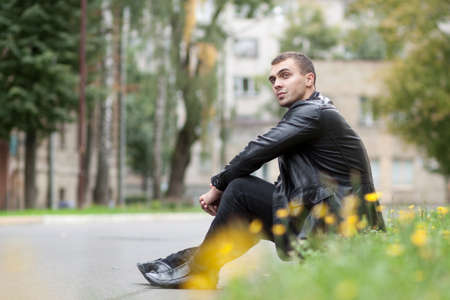 portrait of the young man in a leather jacket sitting over road