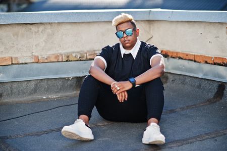 Stylish arabian muslim boy with originally hair and sunglasses posed on streets at roof.