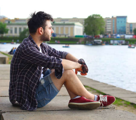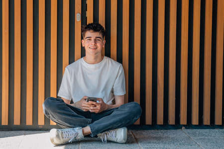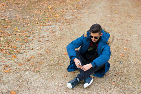 young man sitting on the street floor with mobile phone