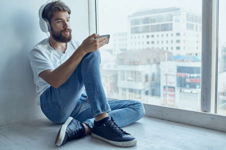 man in white t-shirt sitting near the window in headphones listening to music