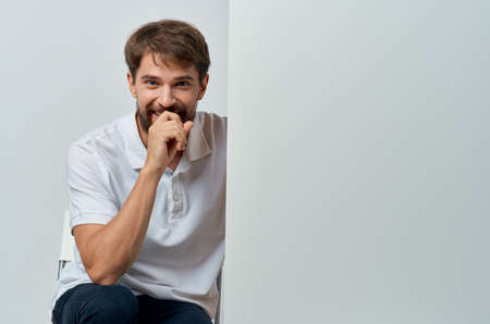 Cheerful man in a white t-shirt mocap poster discount advertising White background