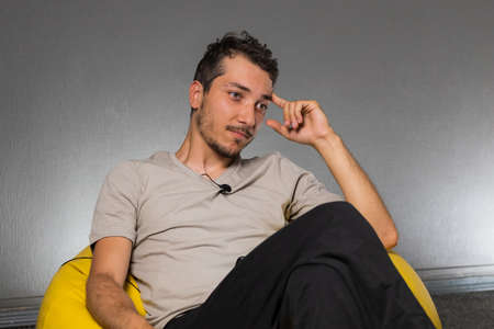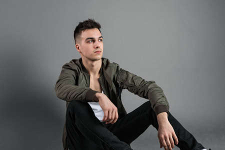 Portrait of a young man sitting on a stool in a studio. Copy space.