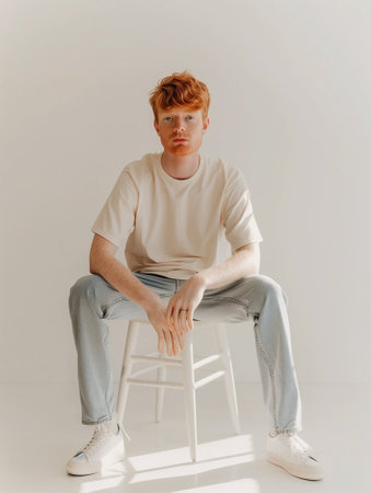 Portrait of a red-haired serios young man with a beard and moustache in a white T-shirt sitiing on the chair on a light background.