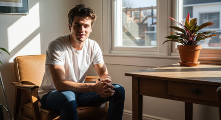 A young man sitting in a cozy room with natural light coming through the windows, wearing a casual white t-shirt and jeans, with a potted plant on the table