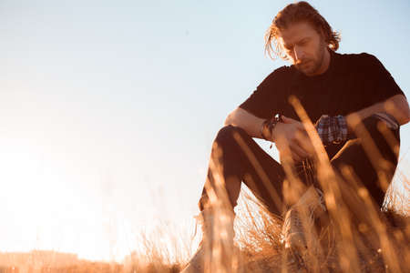 pensive man in the setting sun sits on the ground
