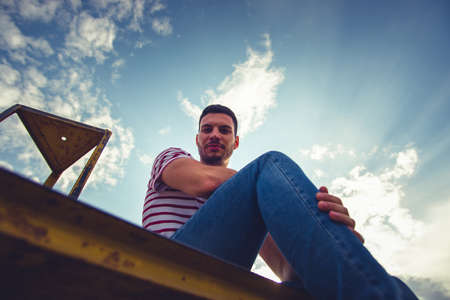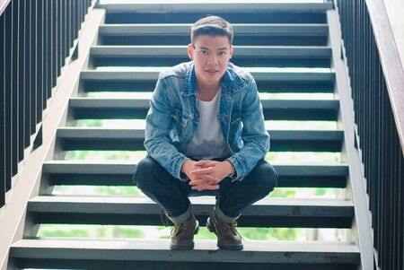 young man sitting on the stairs in the city, looking at the camera