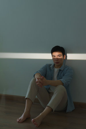 A young Asian man sits on the floor with his knees drawn up, leaning against a light blue wall. Sunlight filters through a window, casting a warm glow and creating shadows across the floor.