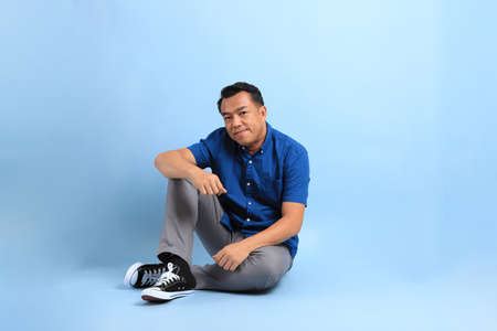 The Asian middle aged man with blue shirt sitting on the floor.