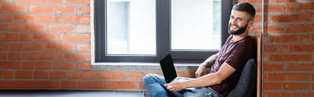 horizontal image of happy businessman using laptop with blank screen