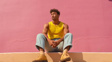 A young man sitting on a set of stairs. Generative AI image.