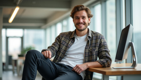 A cheerful young man with tousled hair sits comfortably at a sleek desk in a contemporary office, radiating positivity and confidence. His casual attire and relaxed posture create an inviting atmosphere, perfect for inspiring creativity and collaboration in a professional setting.