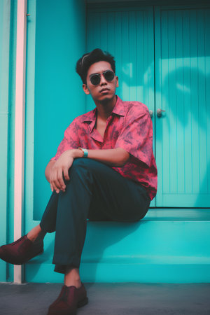 Handsome young Asian man in a red shirt and sunglasses sitting on a green wall