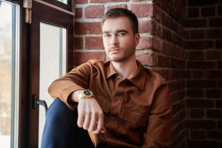 A handsome guy in casual clothes looks at camera sitting on the windowsill. Men's beauty, fashion. Casual style.
