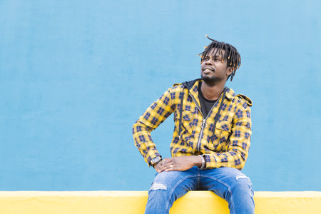 black man on a yellow wall with blue background