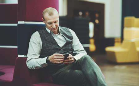 A handsome hispanic man entrepreneur is smiling while reading work chat conversations in his smartphone while sitting on a lilac sofa of a modern office coworking area; a copy space place on the right