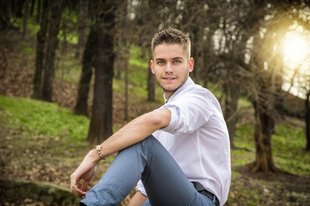 Portrait of handsome smiling man looking at camera while sitting against of sunlit forest.Backlit.