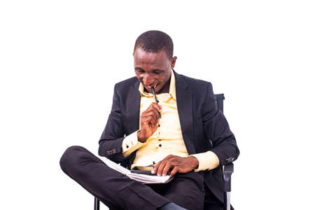 portrait of a businessman sitting on a chair thinking what to write in the notebook with the pen in his mouth.