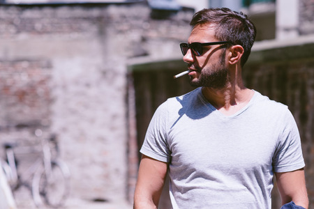 Portrait of young man with sunglasses smoking a cigarette in the street