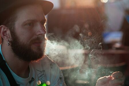 Concept. Smoke enveloped the head man. Portrait of a Bearded, stylish man with smoke. Secondhand smoke.