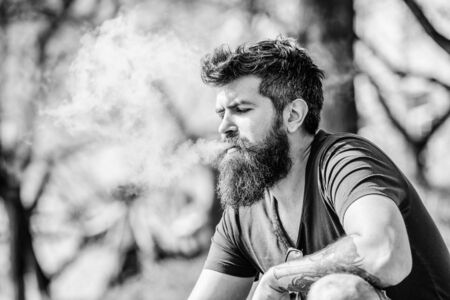 Man long beard relaxed with smoking habit. Man with beard breathe out smoke. Clouds of flavored smoke. Stress relief concept. Bearded man smoking vape. Smoking electronic cigarette. Smoking device