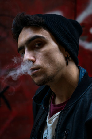 A vertical shot of a cool young Caucasian guy from Spain posing smoking in Valencia, Spain