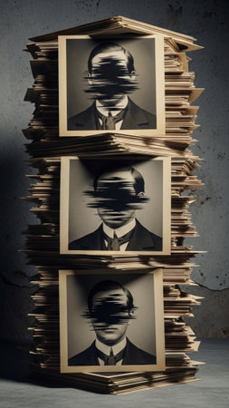 A striking vertical composition capturing a large, stacked collection of antique, historical photogr