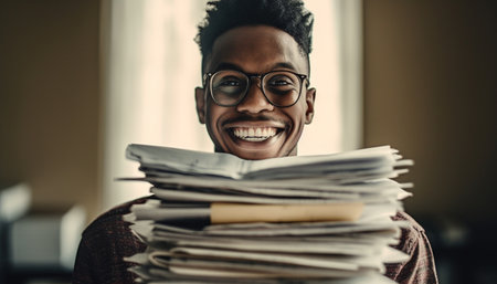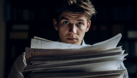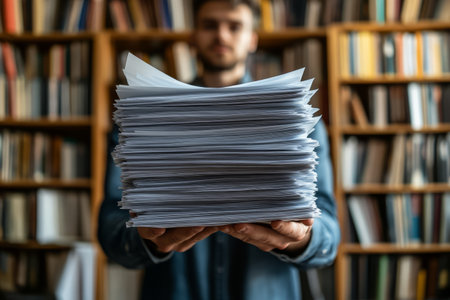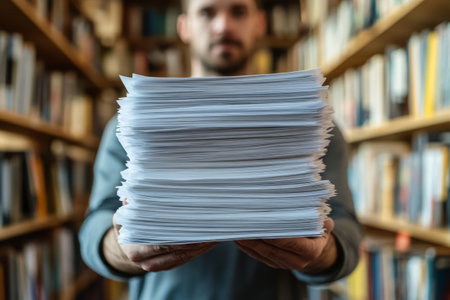 Man holding a large stack of paper in a library. Concept of paperwork, education, research