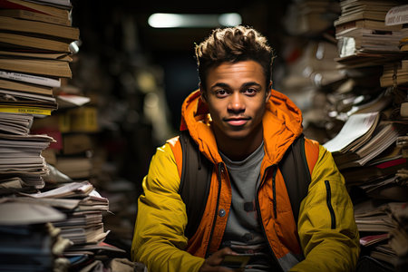 A contemplative man in a library setting, engulfed by stacks of books.