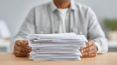 A man sits at a wooden desk holding a stack of paperwork, reflecting the challenges of organization and productivity in a modern office environment.