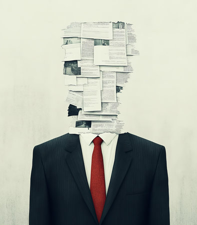 Stressed businessman reading paperwork, surrounded by documents generated by artificial intelligence