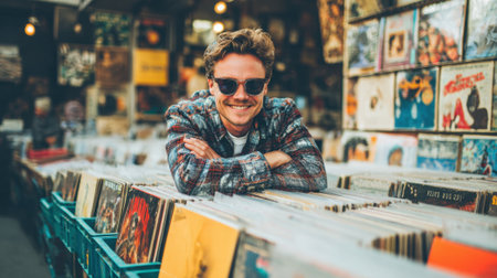 A cheerful man leans on a display of vinyl records wearing sunglasses and smiling widely.