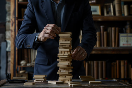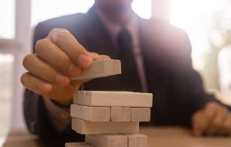 Business man gambling placing wooden block. Business concept investment target and growth success process background present financial information planning, risk and marketing strategy analysis.